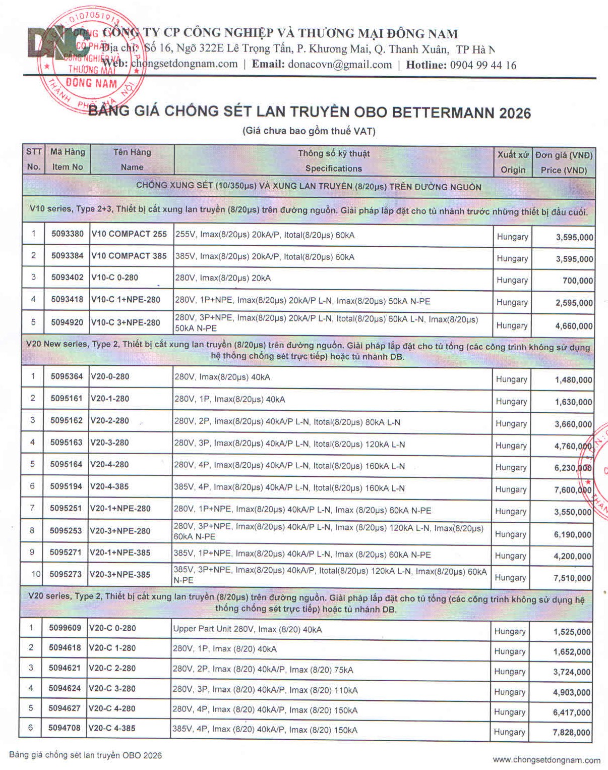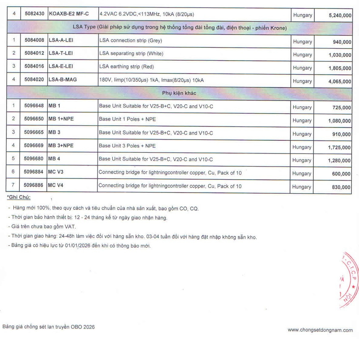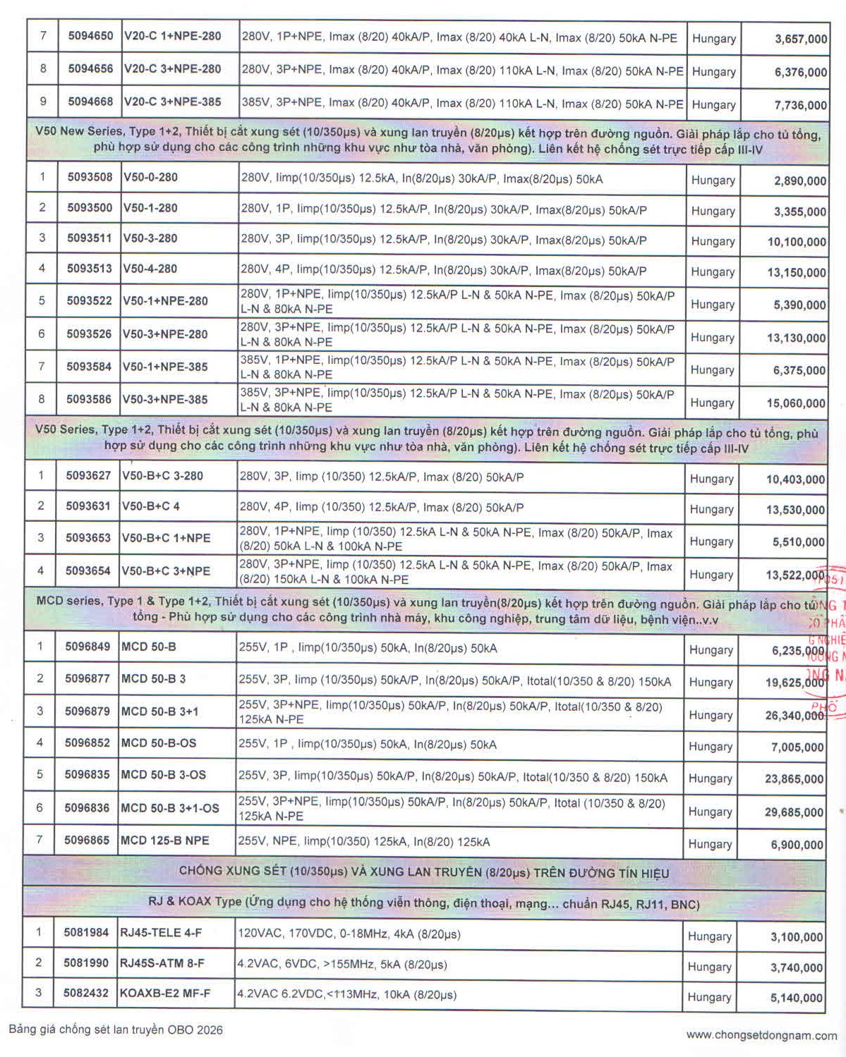 Xem chi tiết bảng báo giá thiết bị chống sét lan truyền OBO: Tại đây