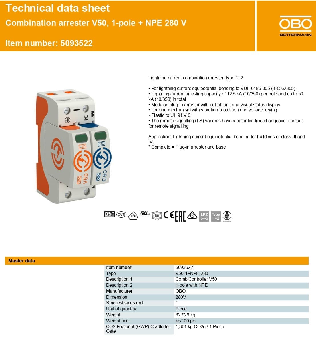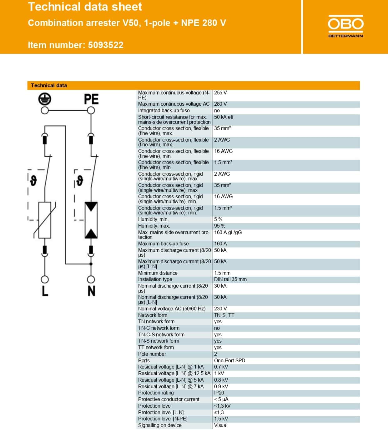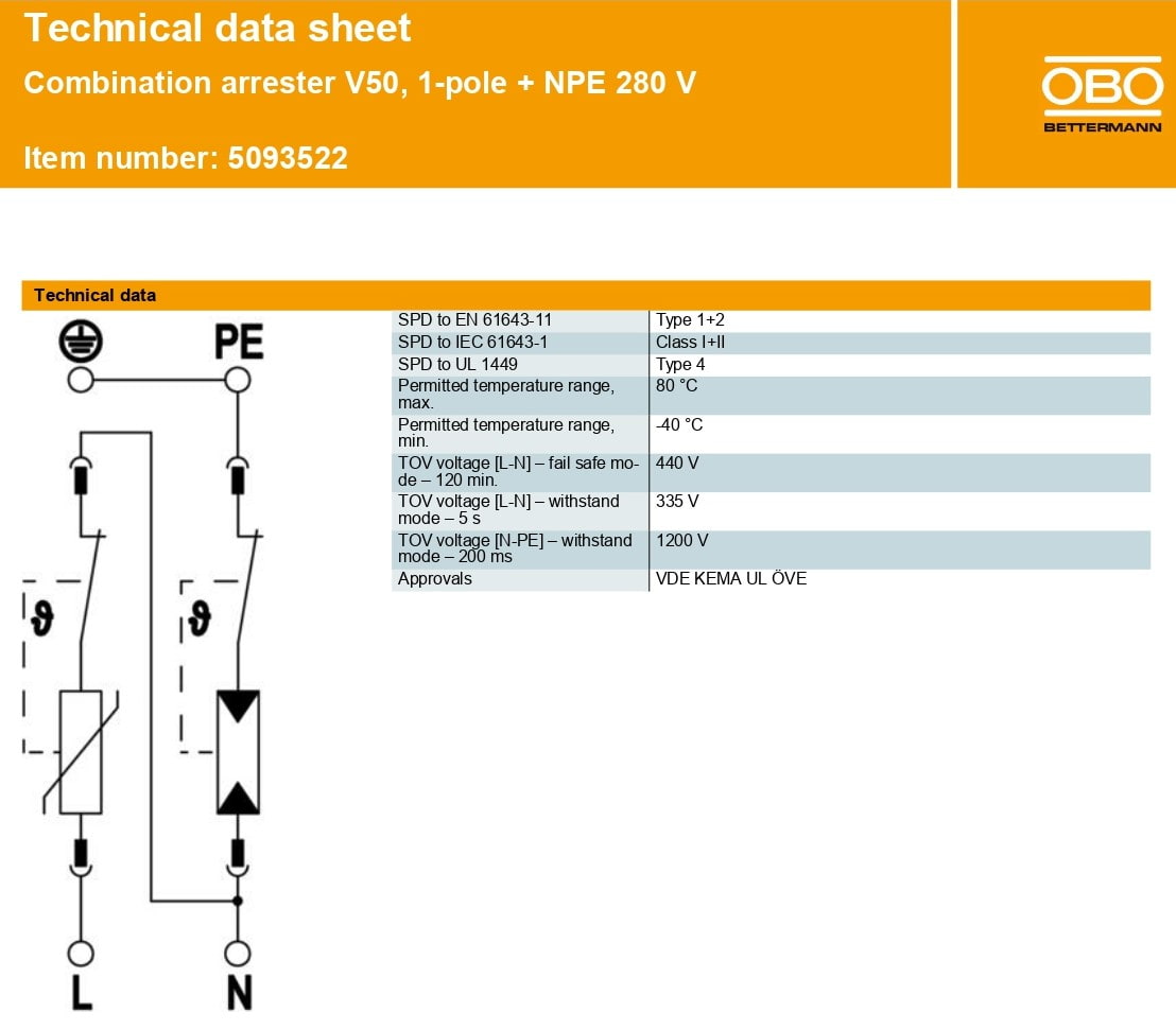 Thông số kỹ thuật SPD chống sét OBO V50-1+NPE-280