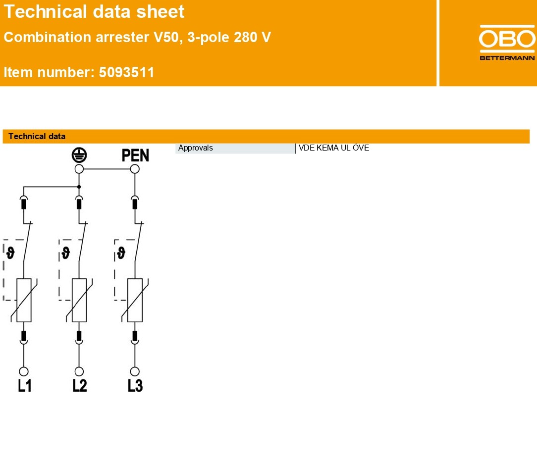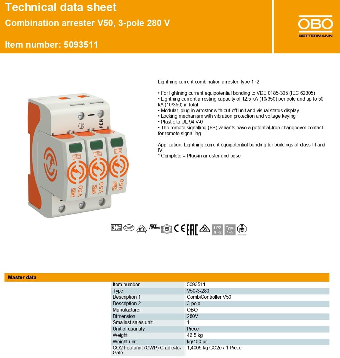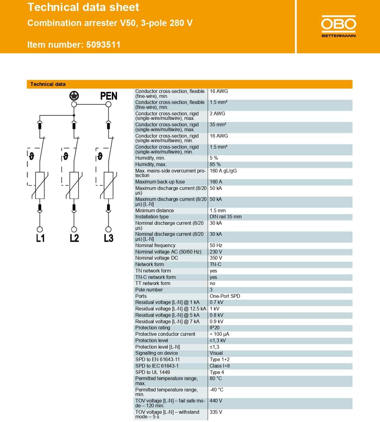 Thông số ký thuật thiết bị cắt sét OBO V50-3-280