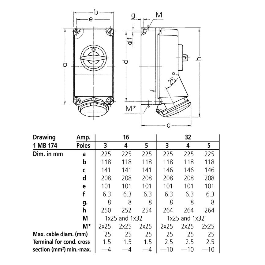 Thông số kỹ thuật ổ cắm 3 pha có khóa liên động, loại không kín nước, 3 p - 32A - 5 chân - IP44