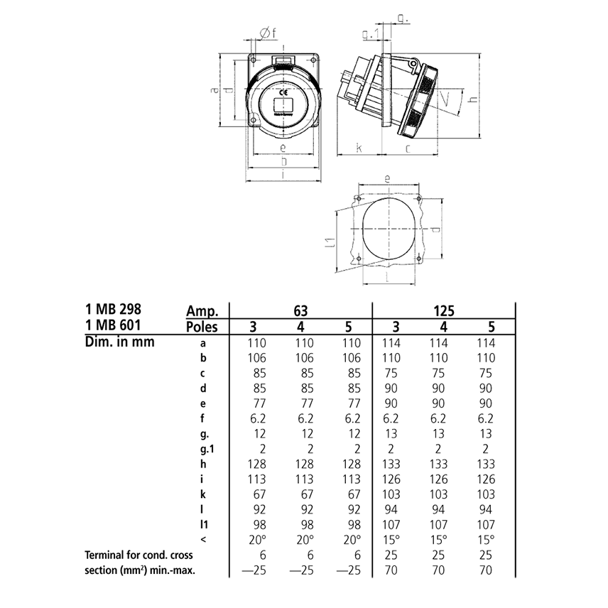 Thông số ổ cắm công nghiệp 1 pha gắn âm, kín nước, góc nghiêng 20 độ 1P - 125A - 3 chân - IP67