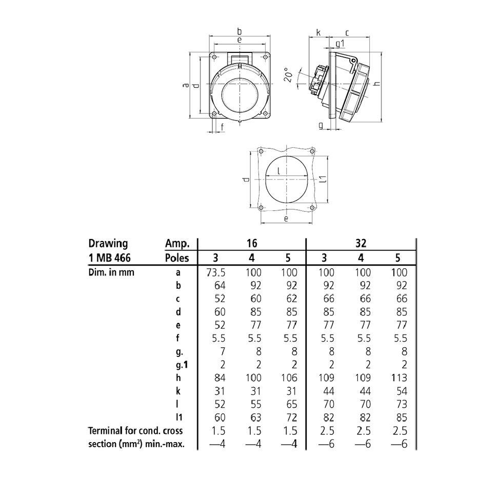 - Loại: Ổ cắm công nghiệp gắn âm, kín nước dạng góc nghiêng 20°