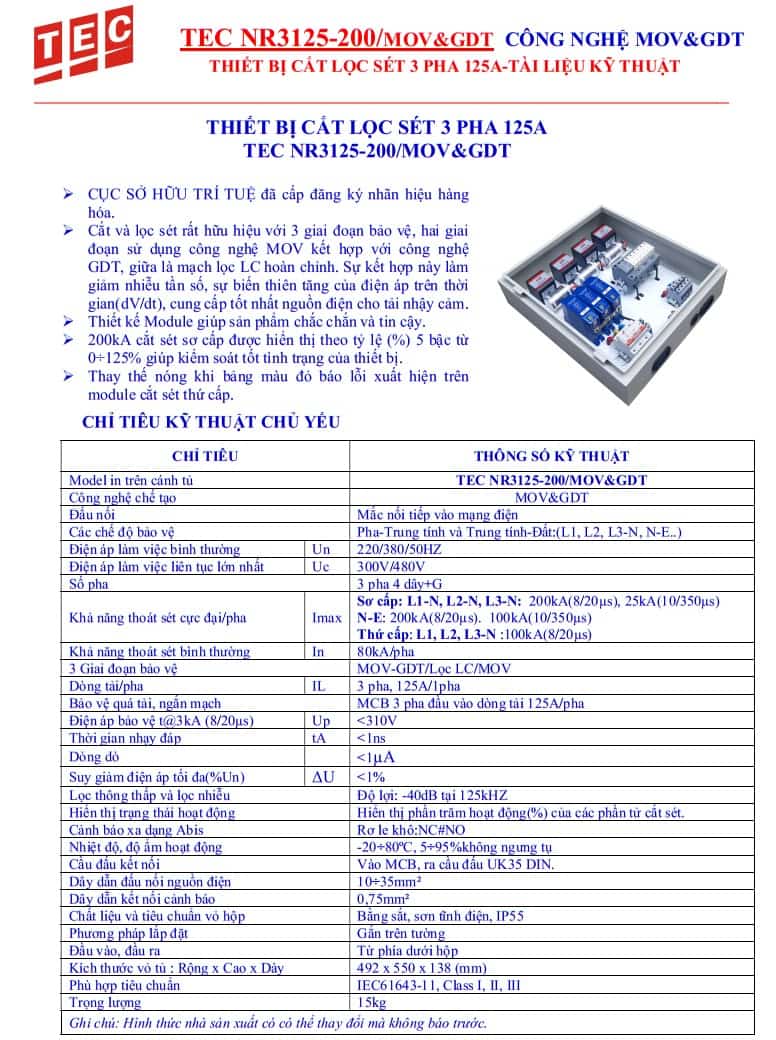 Thông số thiết bị cắt lọc sét 3 pha 125A TEC NR3125-200/MOV&GDT