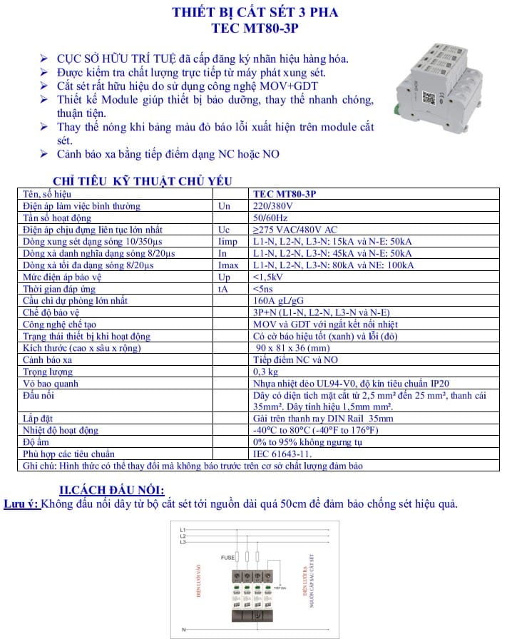Tải Catalogue thiết bị cắt sét 1 pha TEC-MT80-3P: Tại đây